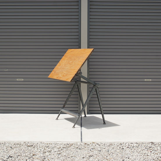 ウィム・リートフェルト(Wim Rietveld)によるデザインのドラフティング・リプライ・テーブルです。1950年代に、リザルトチェア/リボルトチェアなどで有名な、オランダのAhrend de Cirkel社によって生産開始されました。フリソ・クラマー(Friso Kramer)によるデザインの2つ付いている大きな取手で、スムーズにテーブルの角度を変化させることができます。平らにすれば普通のテーブルとしてもご使用いただけます。Vレッグの椅子やフリソクラマーのスツールと同じ哲学で設計されており、リザルトチェア、マルコチェア、ガルファニタスチェア、フリソクラマーのスツールなどとの相性がとても良いテーブルだと思います。