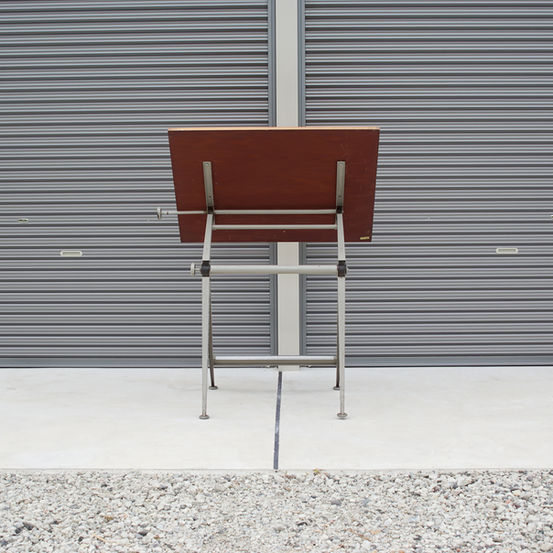 ウィム・リートフェルト(Wim Rietveld)によるデザインのドラフティング・リプライ・テーブルです。1950年代に、リザルトチェア/リボルトチェアなどで有名な、オランダのAhrend de Cirkel社によって生産開始されました。フリソ・クラマー(Friso Kramer)によるデザインの2つ付いている大きな取手で、スムーズにテーブルの角度を変化させることができます。平らにすれば普通のテーブルとしてもご使用いただけます。Vレッグの椅子やフリソクラマーのスツールと同じ哲学で設計されており、リザルトチェア、マルコチェア、ガルファニタスチェア、フリソクラマーのスツールなどとの相性がとても良いテーブルだと思います。