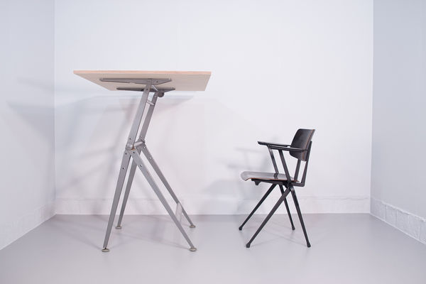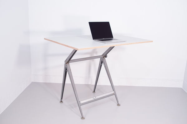 ウィム・リートフェルト(Wim Rietveld)によるデザインのドラフティング・リプライ・テーブルです。1950年代に、リザルトチェア/リボルトチェアなどで有名な、オランダのAhrend de Cirkel社によって生産開始されました。フリソ・クラマー(Friso Kramer)によるデザインの2つ付いている大きな取手で、スムーズにテーブルの角度を変化させることができます。平らにすれば普通のテーブルとしてもご使用いただけます。Vレッグの椅子やフリソクラマーのスツールと同じ哲学で設計されており、リザルトチェア、マルコチェア、ガルファニタスチェア、フリソクラマーのスツールなどとの相性がとても良いテーブルだと思います。