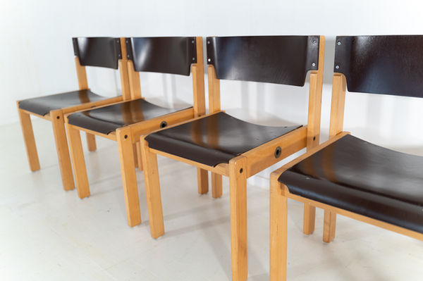 アノニマスなオランダのスクールチェア。可愛らしいフォルムですが、無駄な曲線のないジオメトリックなオランダらしいデザインで、現在でも非常にモダンな佇まいの椅子です。ライトブラウンのフレームとダークブラウンのシートの組み合わせも素晴らしいと思います。座面裏の中央あたりに太いスチールのパイプが入っており、ここで構造をしっかり安定化してあります。使用する際に一番欠けやすい部分であるシートの先端両角を円形に凹ませているディティールも良いアクセントです。スタック可能で数もありますので、自宅用だけでなく、カフェやレストラン、ショップなどにもお勧めです。
