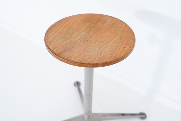 フリソ・クラマー(Friso Kramer)によってにデザインされ、アーレンド社(Ahrend de Cirkel)によって生産されたワーキングスツール。座面の高さをハンドルで調節可能です。ハンドルのデザインは同じくフリソ・クラマーデザインのリプライ・ドラフティングテーブルと同じ形状になっており、このテーブルと合わせて使用することを考えて設計されたものだと思われます。ディティールの美しいインダストリアルなスツールだと思います。高さがあるので、ハイスツールとしてご使用いただけます。