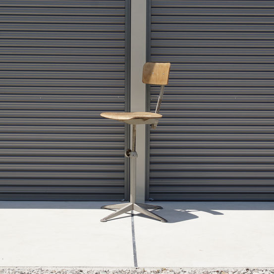 フリソ・クラマー(Friso Kramer)によってにデザインされ、アーレンド社(Ahrend de Cirkel)によって生産されたワーキングスツール。背もたれと座面の高さを2つのハンドルで調節可能です。ハンドルのデザインは同じくフリソ・クラマーデザインのリプライ・ドラフティングテーブルと同じ形状になっており、このテーブルと合わせて使用することを考えて設計されたものだと思われます。脚の形や背もたれの微妙な角度など、緻密に計算されたディティールの美しいインダストリアルなスツールだと思います。高さがあるので、ハイスツールとしてご使用いただけます。