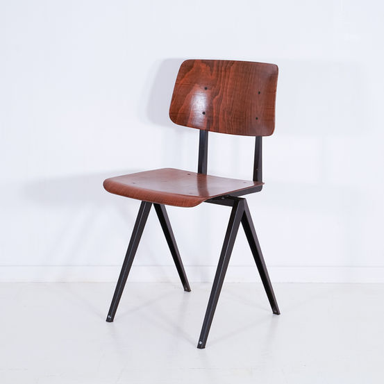 ガルファニタス社によって作られた、Jean Prouvé(ジャン・プルーヴェ)やFriso Kramer(フリソ・クラマー)の影響を明らかに感じられる、60年代オランダの素晴らしいインダストリアルデザインです。Vレッグのマルコチェアに近いフォルムですが、シートからバックにかけて、直角に曲げられたフレームラインが特徴的です。シートにはドイツのPAGHOLZ社による、パグウッドというブナ合板と特殊樹脂を複合圧縮した強化材を採用しています。パグウッドはショック、ねじれ、引っ掻き、耐水、そして耐火性まである、夢のような素材です。